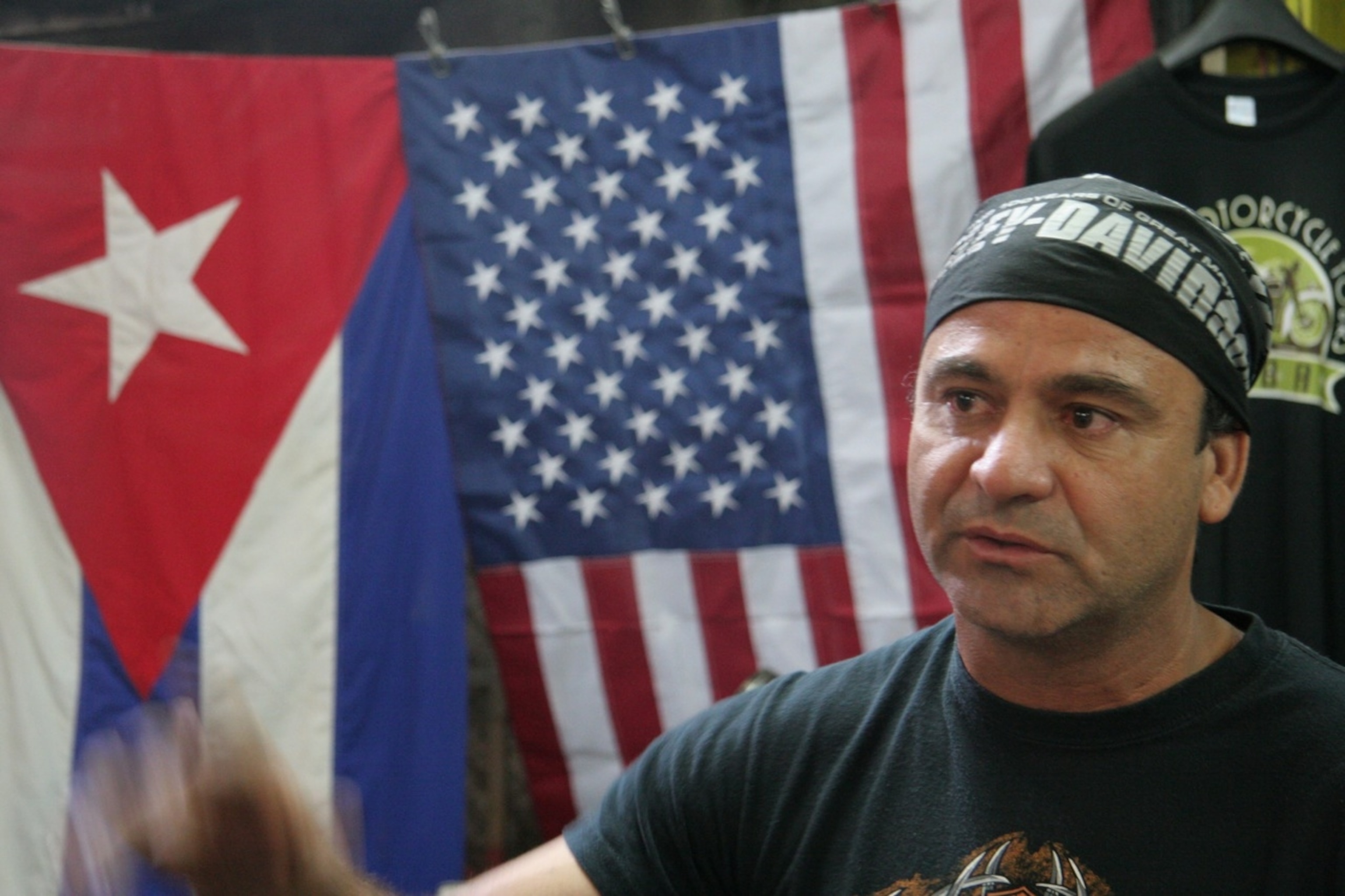 Two flags hang in the garage: Cuba on the left, America on the right.