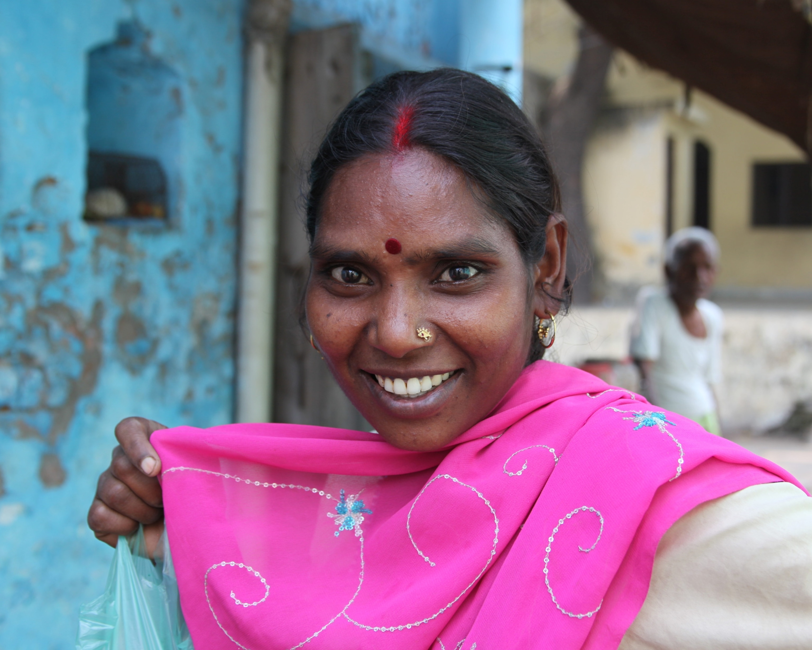 Hindu temples surprise me, wedged between the square block houses, with sky-blue painted doors, scrawled with ancient designs, hung with colored lights, flower garlands. At dusk the sun is pink and one hour later, the moon turns silver like the jingling bangles around the women’s brown ankles. The women are beautiful—and their clothing is beautiful. No matter the drab backdrop of light brown everything—wait five seconds and another woman will surely pass, wrapped in hot pink or vermillion or light turquoise silk, the hot air swirling her colored clothing like a stage curtain.