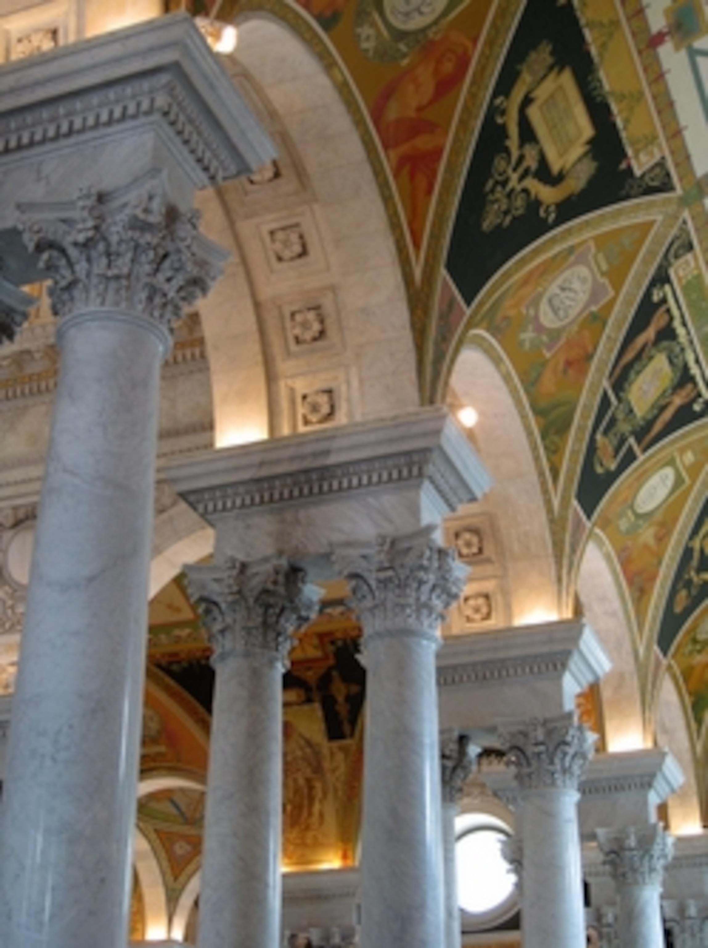 First stop: the beautiful Thomas Jefferson Building in the Library of Congress (above), which has an ongoing exhibit on the second floor featuring the books around which the great library developed. When the British burned the Capitol in 1814, the entire Congressional Library was destroyed. Jefferson could relate because when his family home, Shadwell, burned in 1770, he grieved the loss of his books more than anything. So, in a controversial move, he sold his personal library to Congress for $23,950 in 1815. This original library has been restored in the exhibit, with Jefferson’s books catalogued in an order he described as “sometimes analytical, sometimes chronological, and sometimes a combination of both.” Based on Francis Bacon’s method, he divided his books into three categories–Memory, Reason, and Imagination (which included History, Philosophy, and Fine Arts)–and from there, into 44 smaller categories. Two thousand original books remain, while those ruined by fire and wear have been replaced with different versions of the same edition.