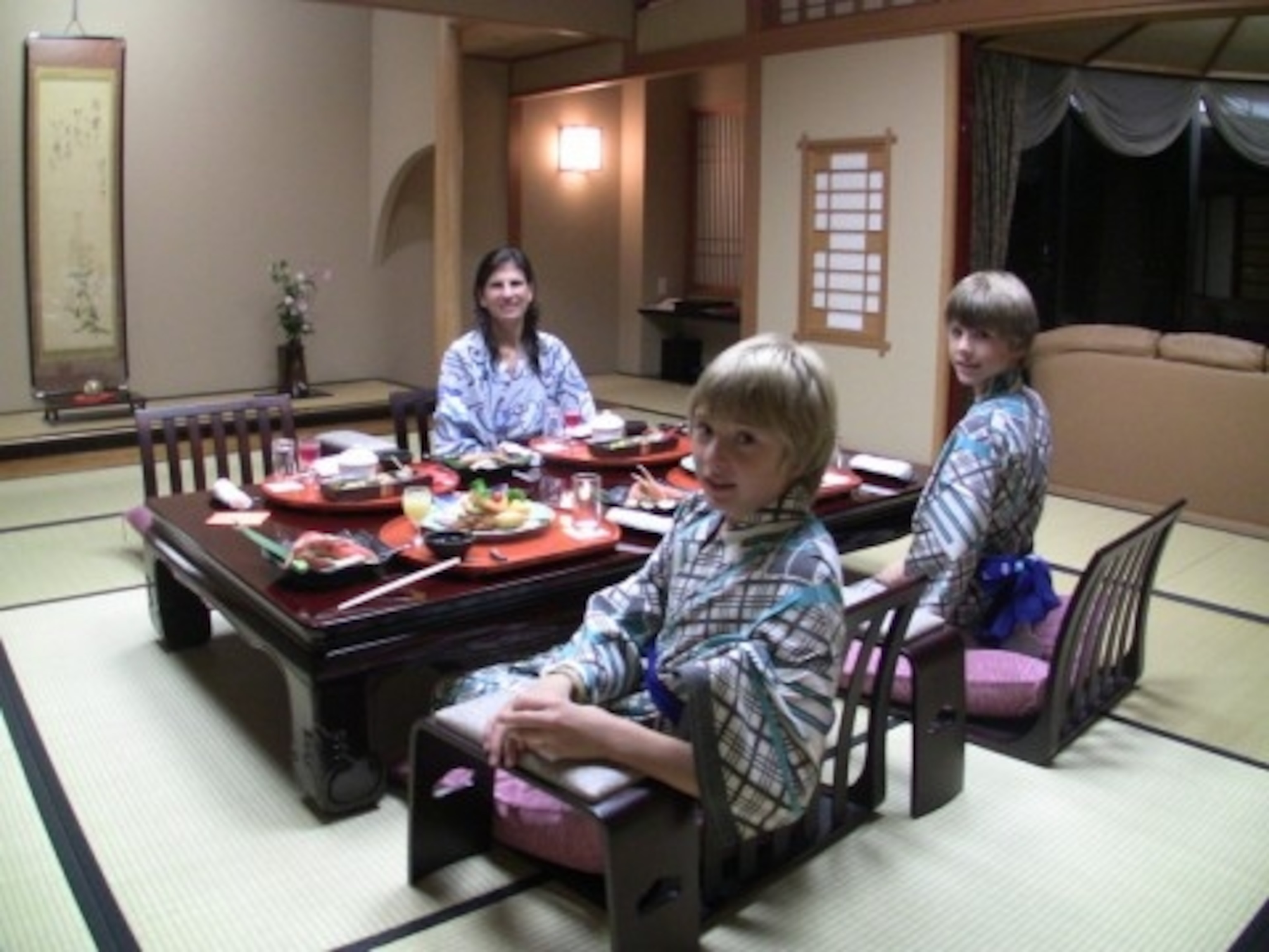 The first day we spent the afternoon just relaxing and appreciating the scenery at the Tadaya Ryokan in the seaside village of Wakura-Onsen, famous for its hot springs baths. The boys and I did some fishing and took great pleasure in just hanging out along the water watching the fishermen bring in their catch. For the fifth time in two weeks, we spent the night in our room being served a traditional kaiseki dinner and slept on the tatami mat floor, something all of us have grown to really like. The next day started with a kid-friendly activity, the Notojima Aquarium, although I’m not sure who enjoyed it more, me or the boys.Then we headed for the hills of Yamanaka, a small town known for its fine crafts and beautiful river gorge and bridges. We even had a chance to visit with a wood carver who specialized in making lacquer ware, something that made us value the craftsmanship of everyday Japanese housewares. That night, we stayed at the Kayoutei Onsen overlooking the mountains. By the time the morning rolled around, even the boys started to appreciate the tranquility and Zen-like atmosphere of these onsens – much to my delight (see previous blog!). After searching so hard to find the true essence of Japan, especially with the kids to consider, it seemed to finally come together in a place I least expected.