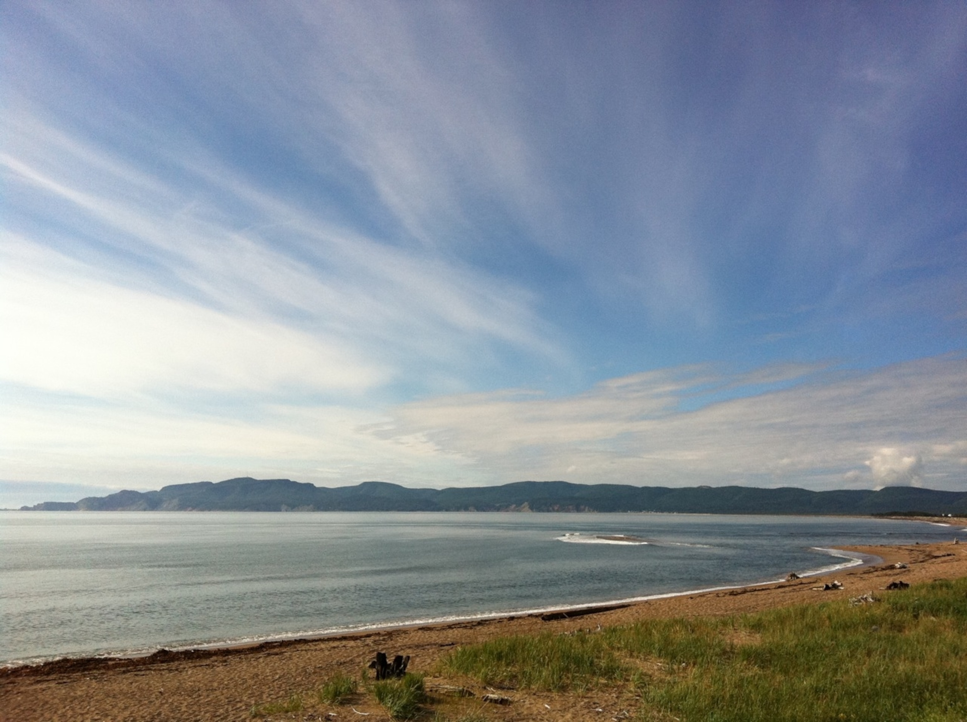 On a physical map of the world, the Gaspésie is the one part of Québec that you can really distinguish, sticking out like a curved left index finger, pointing back towards France. Even if it was a storm that brought him here, it makes geographic sense that Jacques Cartier landed here first. Centuries later, the same storms pass over the coast of Gaspésie, painting the sky with streaks of black, blue, grey, and white and pulling the waves back into shore.