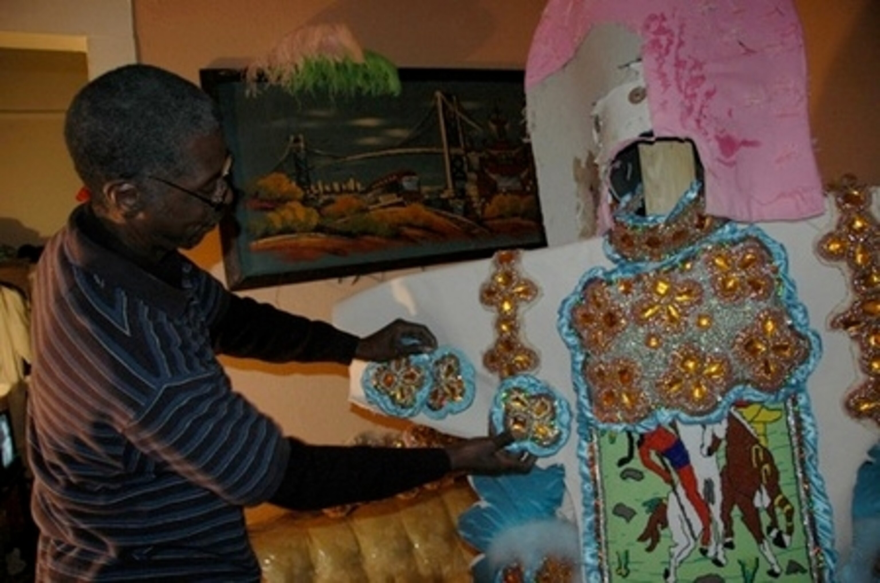 The night we arrived, we got to watch the Red Flag Team practice their music and dance routines. I could try and describe it, but I’ll let the video speak for itself. And in between all of the dancing, I had the chance to chat with the spyboy of the tribe, Leon Joseph, and then got a special treat: Joseph was hard at work at his Indian costume, and he gave us a glimpse of his work in progress. He’s spent the entire year beading the beautiful front pieces he showed us, and even offered a secret, that he uses a football helmet to support his headdress. I can’t promise that you’ll be able to see a costume, but if you want to learn more about the Mardi Gras Indian culture, Handa Wanda’s provides a great chance to see it first hand.