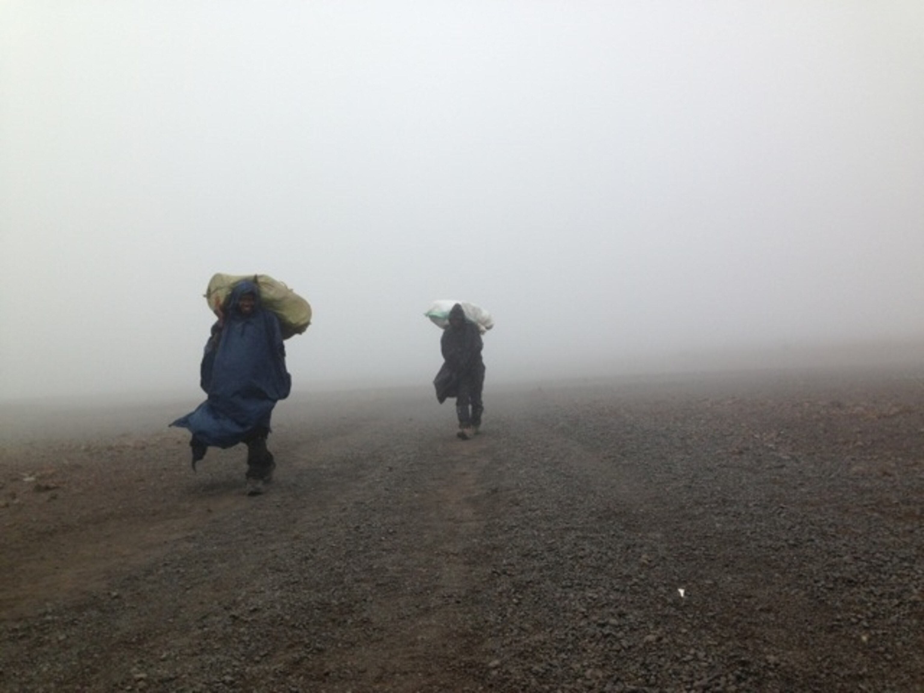 The sight of a peer getting carried off the mountain was quite sobering. Our five-minute rest stop at Kibo Pass was no pick-me-up, either. In great contrast to the beauty of the day, I soon found myself in a post-apocalpytic wasteland of shadowed boulders and dense fog, livened up only by the creepy white-necked ravens who hopped about ominously, as if looking for bones to pick.