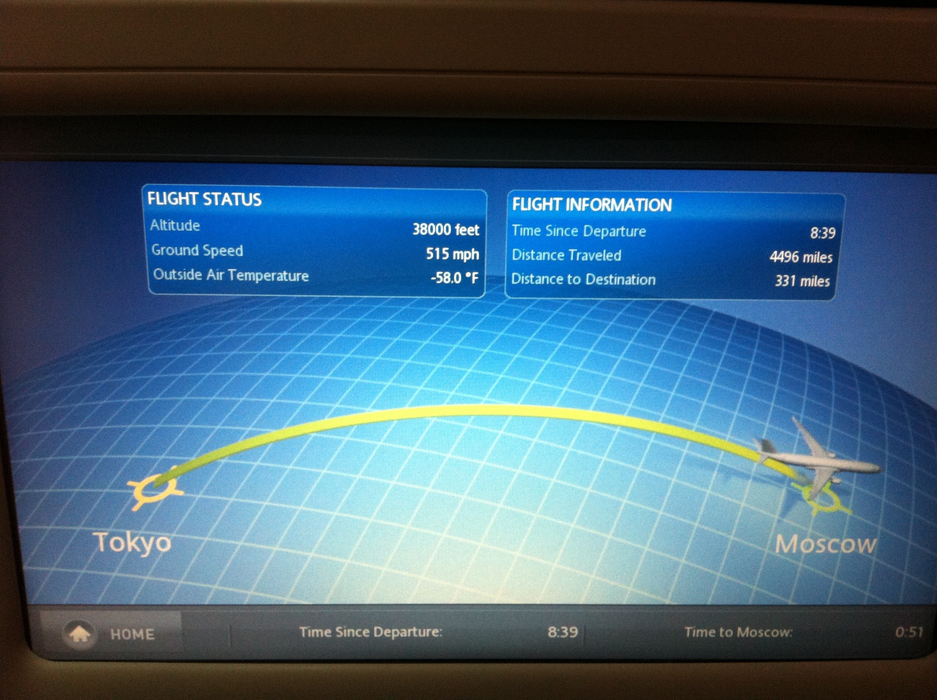 Ten hours after leaving Japan, I landed in Russia: Aeroflot, Flight 582 Tokyo–Moscow. No matter how much I travel, I will never lose the thrill of holding a ripped boarding pass stub in my hand, especially when said stub is printed with the words Tokyo and Moscow. The true distance between these two capitals is vast. All throughout my flight, I studied the arching green line on the digital screen, stretching over Kamchatka and across all of Siberia. I was watching movie number four by the time we reached the Urals, promising to carry me to the other side — to Europe.