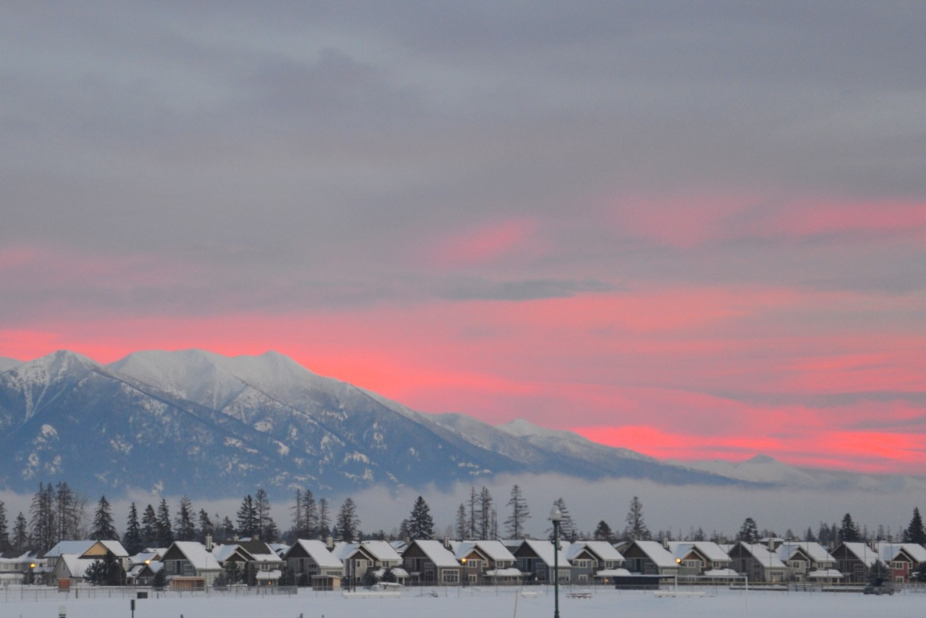 When traveling, we designate these first few hours of arrival as “getting situated” and for me, this is always a time of important first impressions—the kind from which toponyms are born. Montana is a fitting title for what I’ve seen so far, but based on my first night of getting situated in Whitefish (where I have yet to see a white fish), I could easily rename this place any of the following: Pink Clouds, Snowy Fields, Super Nice People Who Go Out Of Their Way To Help Strangers, Good Burgers, Smells Like Peanut Butter Cookies, Shy Turkeys, Emergency Break on Ice, or Taxidermy.