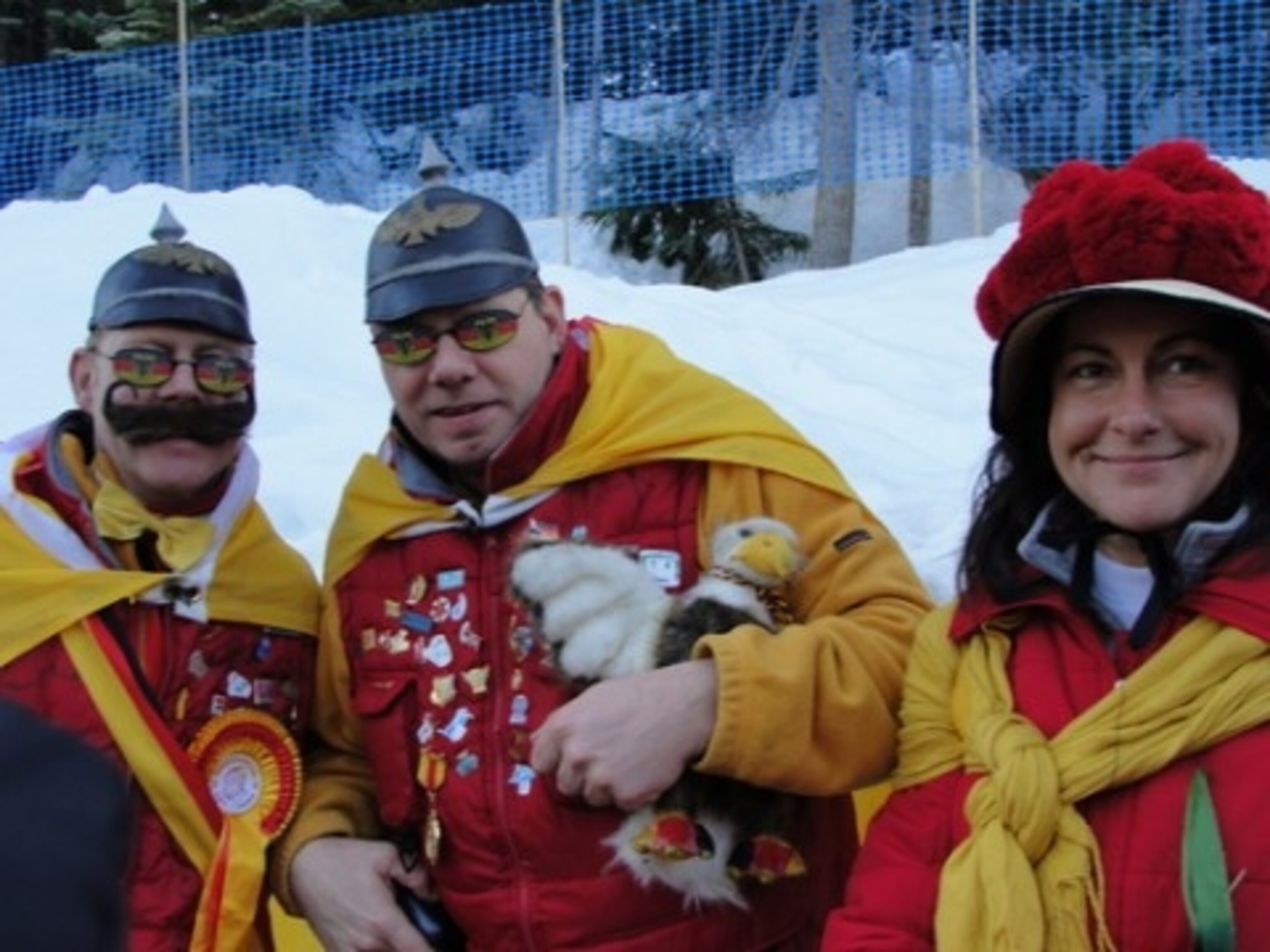 Aside from being closer to the action, being on the ground means you are in the center of roving bands of nationalist party-goers, all seemingly trying to out-do each other with costumes, noisemakers, signs, and flags. In a class by themselves are the Canadians, who make up the vast majority of ticket holders at most events. They are the quietest of the national groups until their athletes are on course–then they turn on sheer power of their numbers with bells and flag waving that can drown out any other national group. Only the Netherlands came close at speed skating on February 15, with their de rigeur orange hats and shirts and enthusiastic cheering–they were clearly organized for the events with block seating and organized cheers.