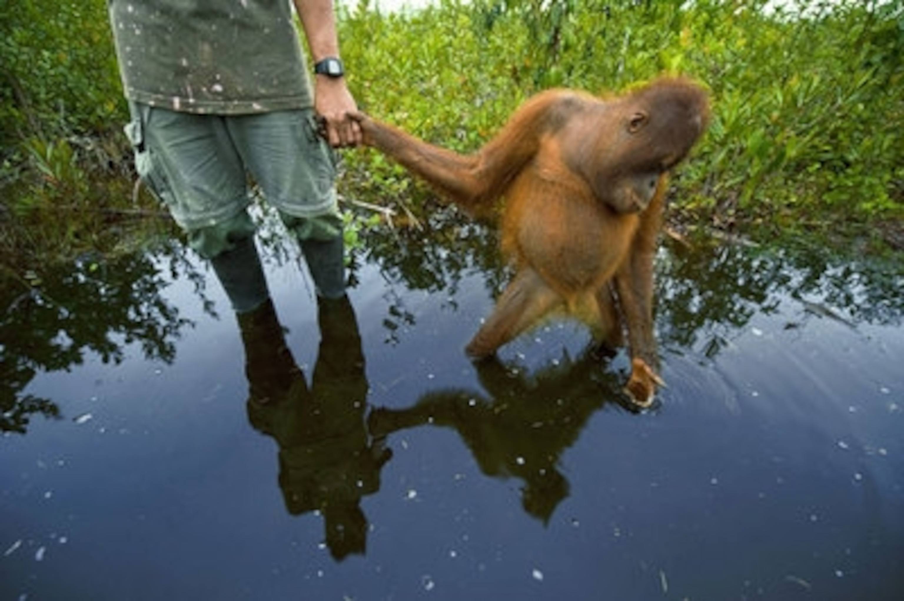 The idea behind the week is to spotlight the tenuous situation of orangutans in Borneo, the only place besides Sumatra where orangs live in the wild, and where their rain forest habitat is being systematically destroyed week after week by logging, mining, and to make room for vast oil palm plantations. Palm oil is used in things like shampoo, cookies and biodiesel. National Geographic’s November issue contains a feature article by Mel White on the situation in Borneo, one of the most biologically rich regions on Earth, and one of the most threatened. When loggers cut down the rain forest the orangutans can still flourish, but when the logged forest is later burned to the ground in order to plant oil palms, the orangs have no place to go, and often end up as orphans. Smuggling is also a problem. Six-year-old Mugi in the photo above by Mattias Klum was one of a group of orangutans that were smuggled out of Borneo and ended up in cages and for sale in Thailand, and is presently one of 500 orphans at the Nyaru Menteng Orangutan Rescue Center in the Indonesian part of Borneo.
