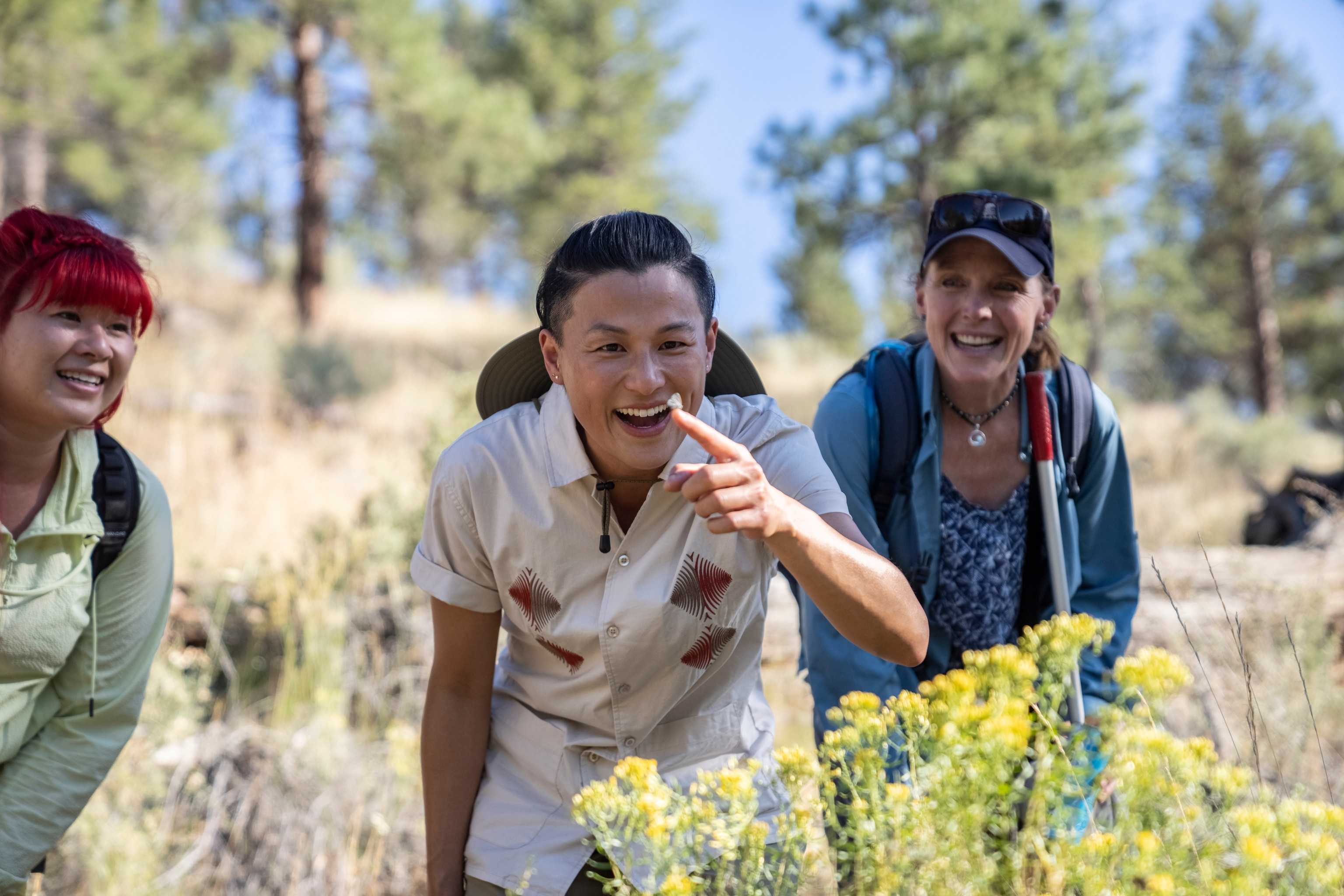 They hike down toward Whychus Creek, where the temperature cools. Plants are in bloom all along the path, and Egertson leads King and Yee to her favorite place to scout for butterflies.
