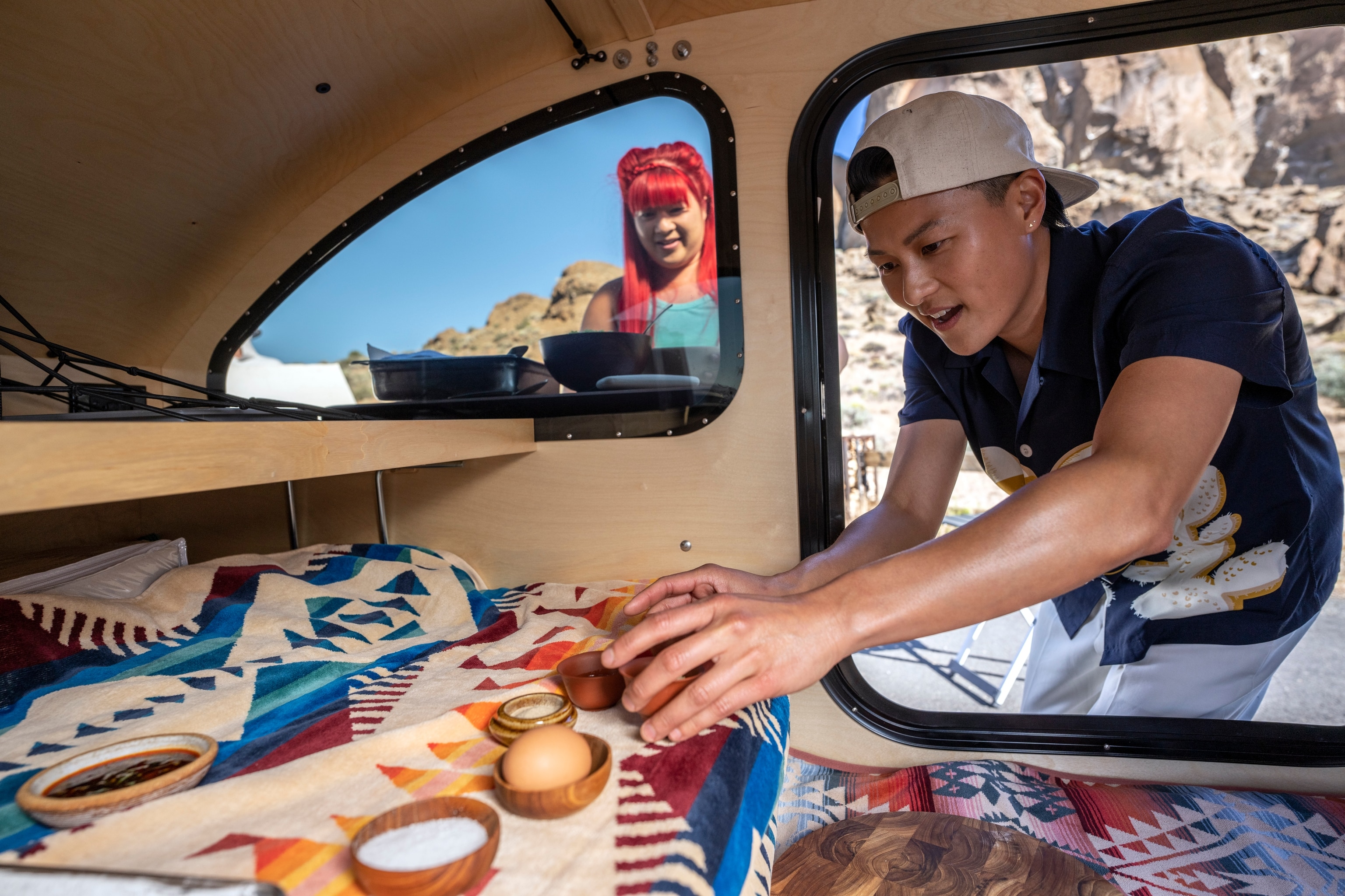 Back in the CX-50, King and Yee pull a camper—packed with everything King needs to make her dish—on the trailer hitch. They drive to a spot with a stunning view of the cliffs and unload the camper. King removes a wok, a large bowl-shaped pan commonly used in Asian cooking, from the trailer and reveals to Yee that they’re going to make her favorite food: dumplings.
