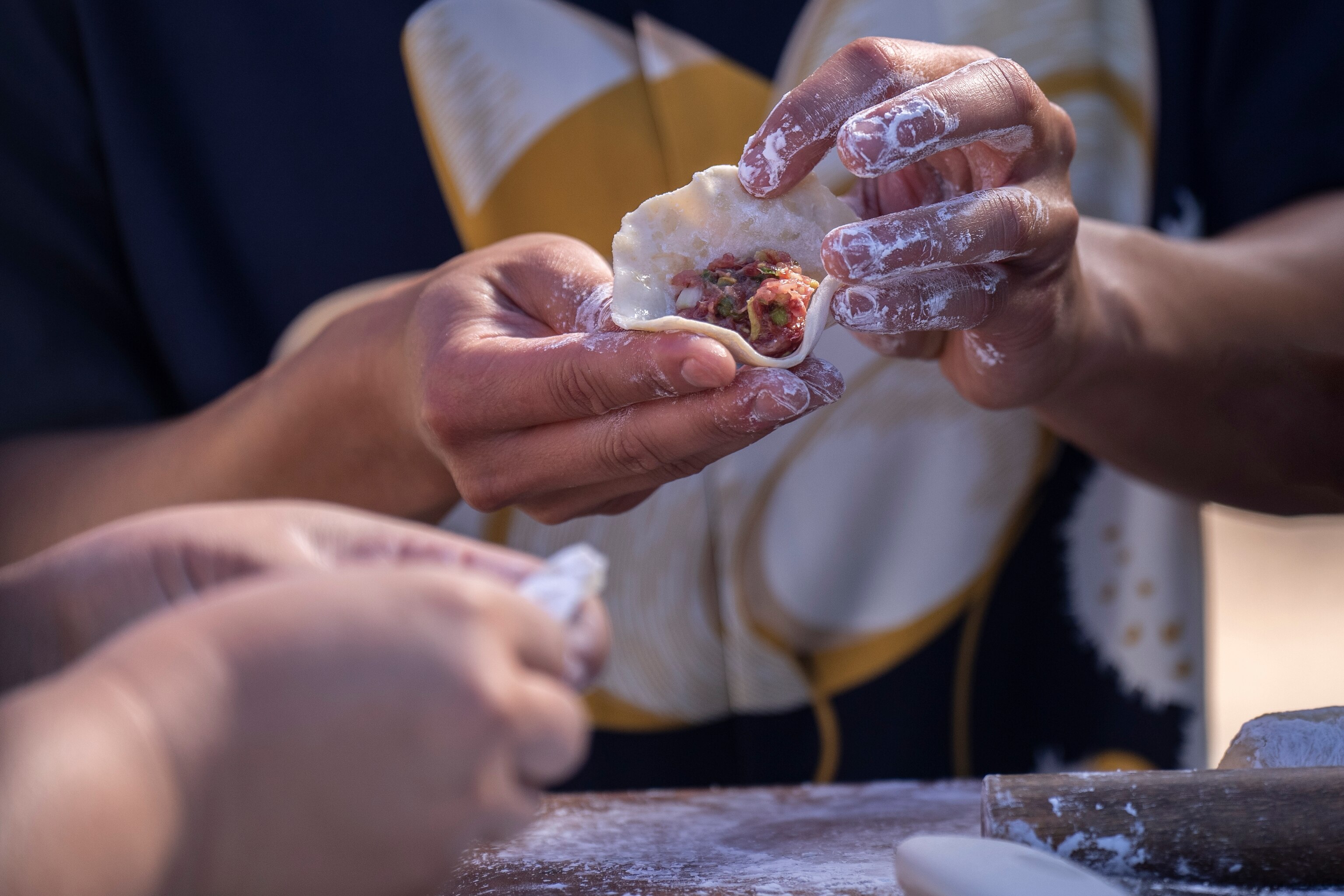 King rolls the dumpling dough into circles that are around four inches wide, and she and King spoon filling on top. They fold the dumplings, each using a technique that was passed down to them through their families and generations before them.