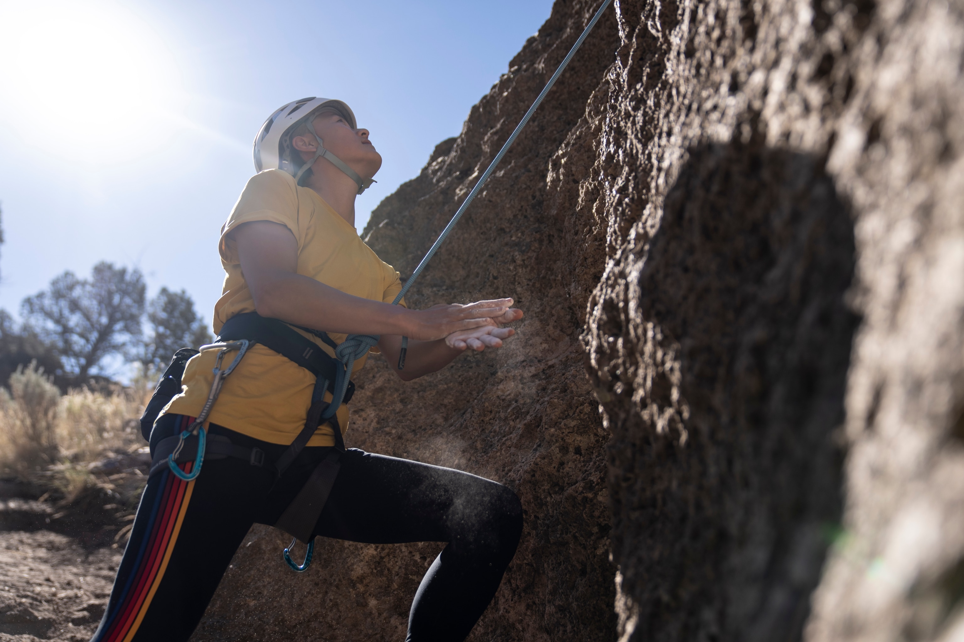 At the base, they gear up in climbing shoes, helmets, and harnesses attached to long ropes. They’re sport climbing, meaning the route has a series of anchor points drilled into the rock face to which they can connect their gear and hook their ropes.