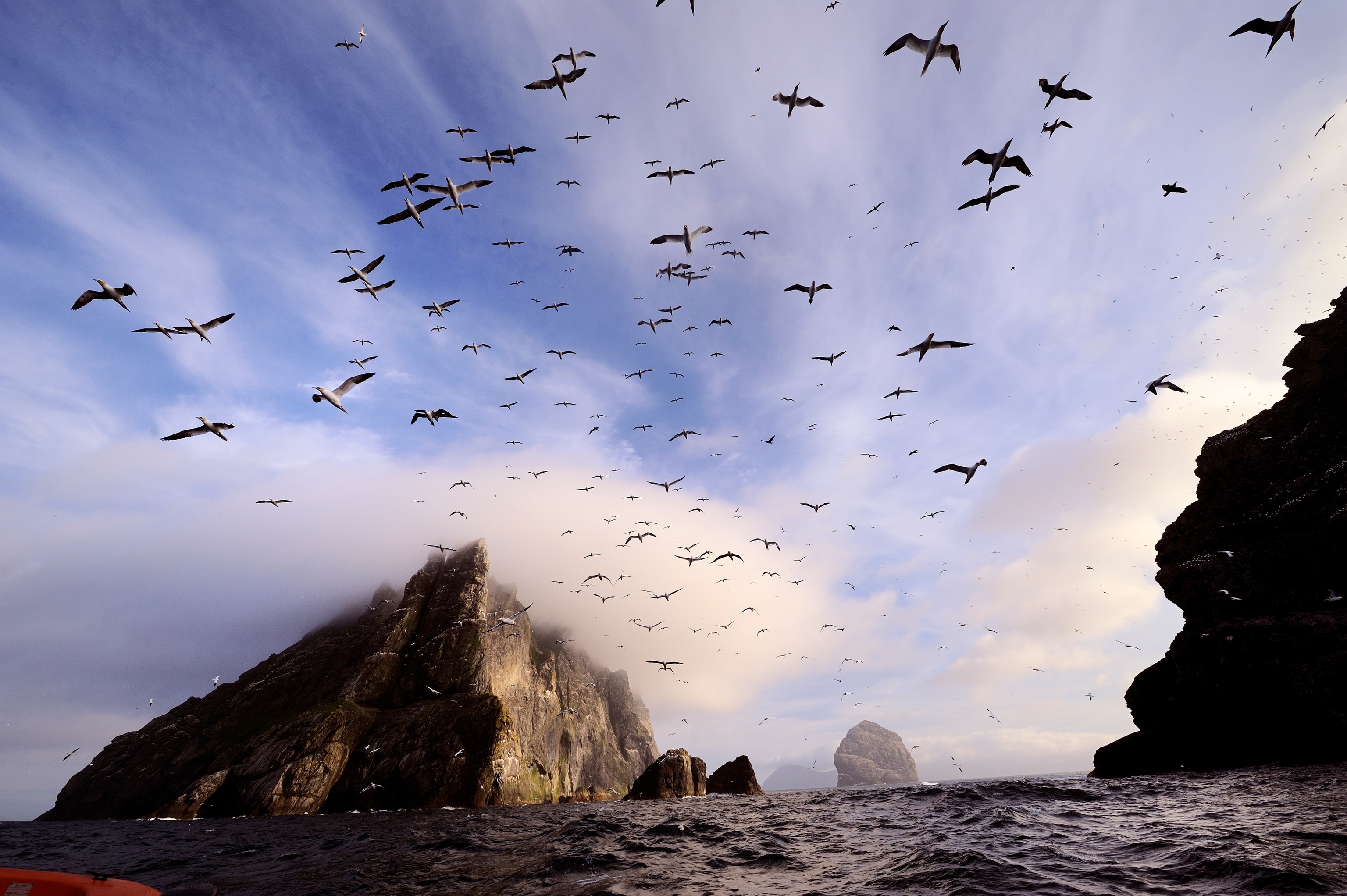 It’s places like this, sculpted by wind and water, that Jim says he finds most irresistible. “There are these stalwart cliffs out there being battered by the Atlantic for millennia, yet somehow holding out in spite of it all,” he says. One particularly epic night at St Kilda left a lasting impression on him. “That evening we had just a few minutes of sunshine out at Boreray, and tens of thousands of gannets came flying out to us—a moment of elation, where I thought I was going to fail and suddenly they saved me,” he recalls.