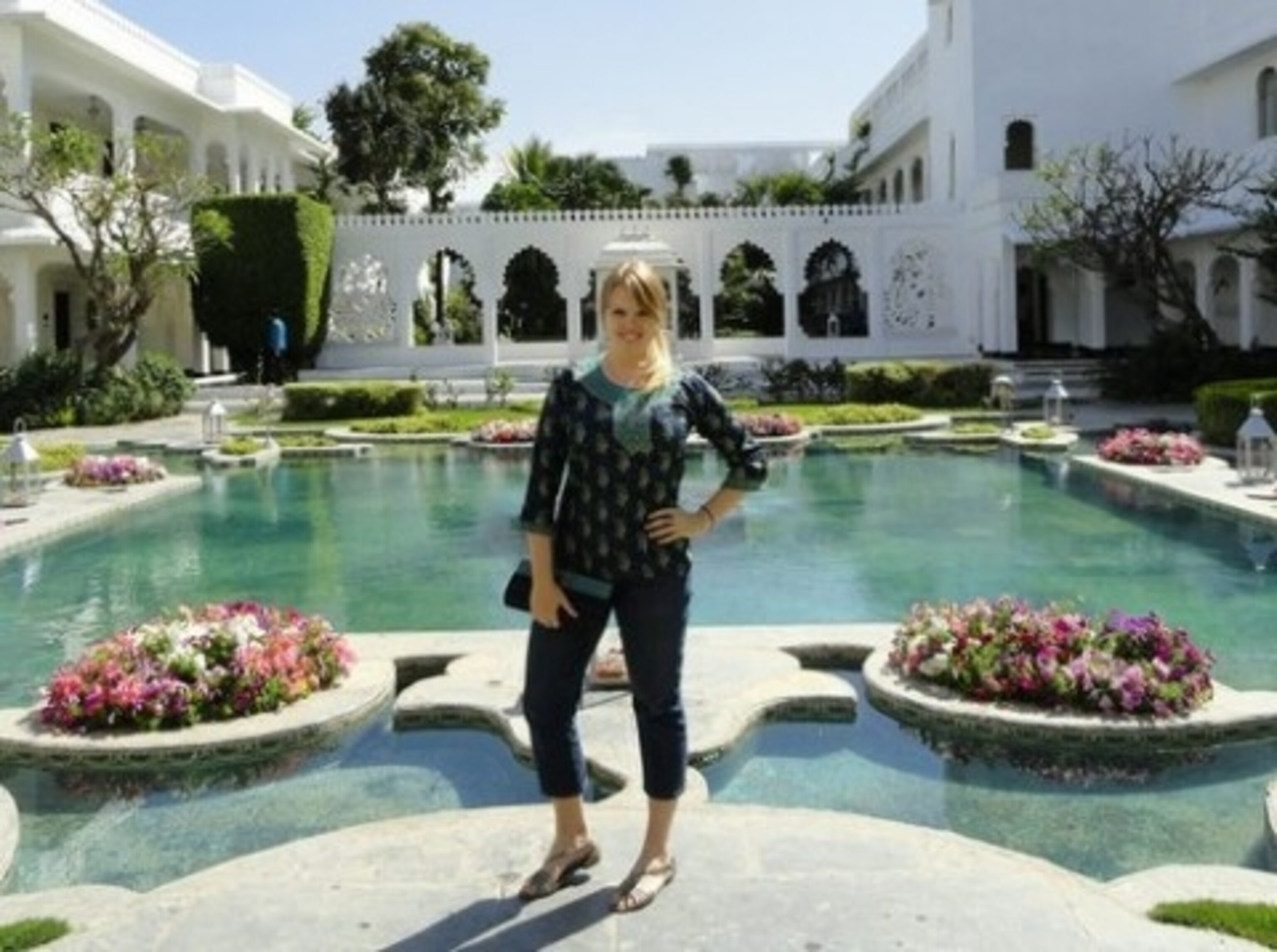Photos: Stephanie at Lake Palace and Stephanie, post-Holi. Courtesy of Stephanie Robichaux.