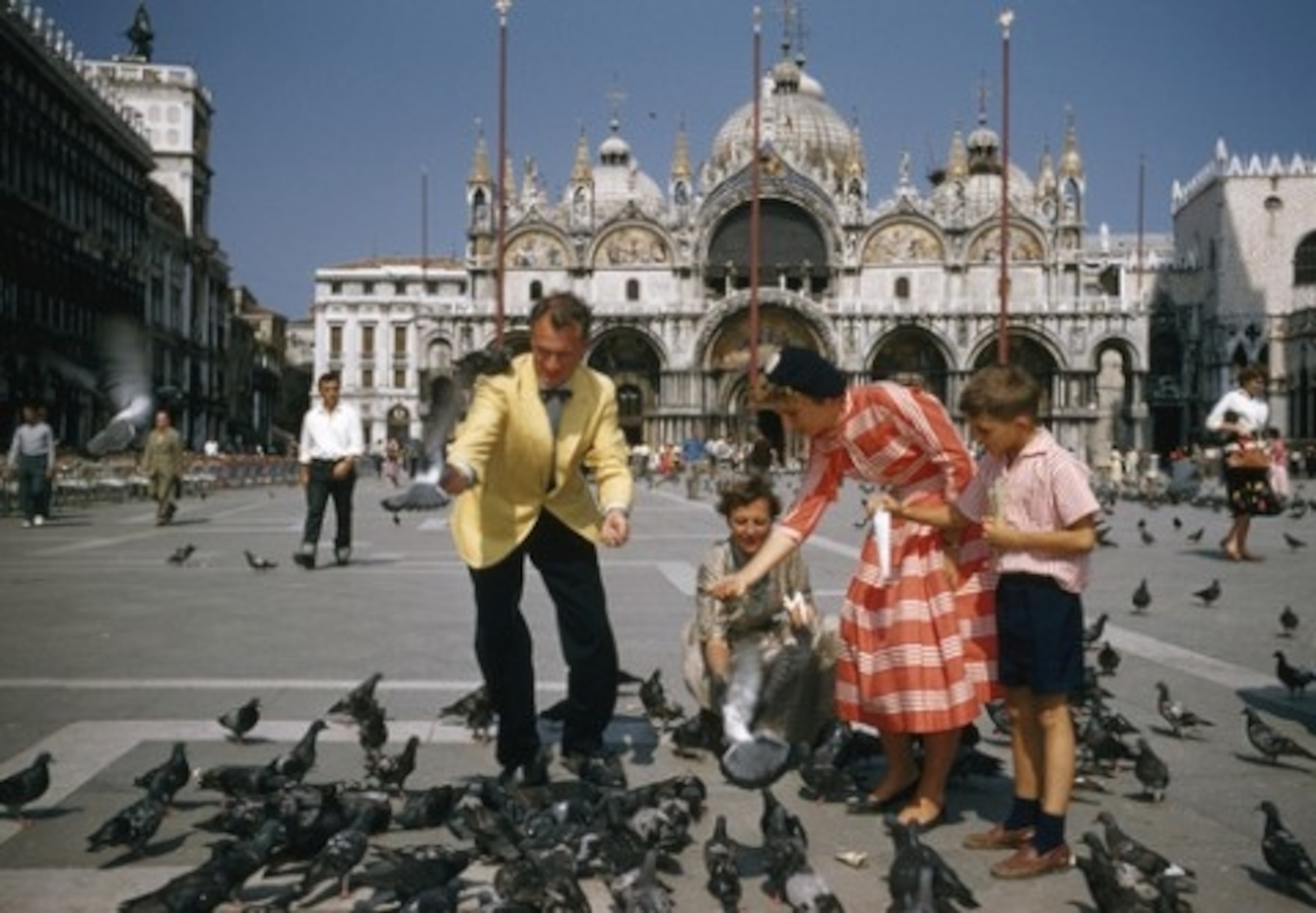 As we mentioned earlier, the National Geographic Museum in DC has just opened a wonderful free exhibit called “Kodachrome Culture: The American Tourist in Europe,” featuring big, luscious blowups of travel photos that appeared in the pages of National Geographic magazine (we call it NGM for short) in the 1950s and ’60s. I particularly liked this photo of feeding pigeons in St. Mark’s Square in Venice, dated 1957, by Ardean Miller III.