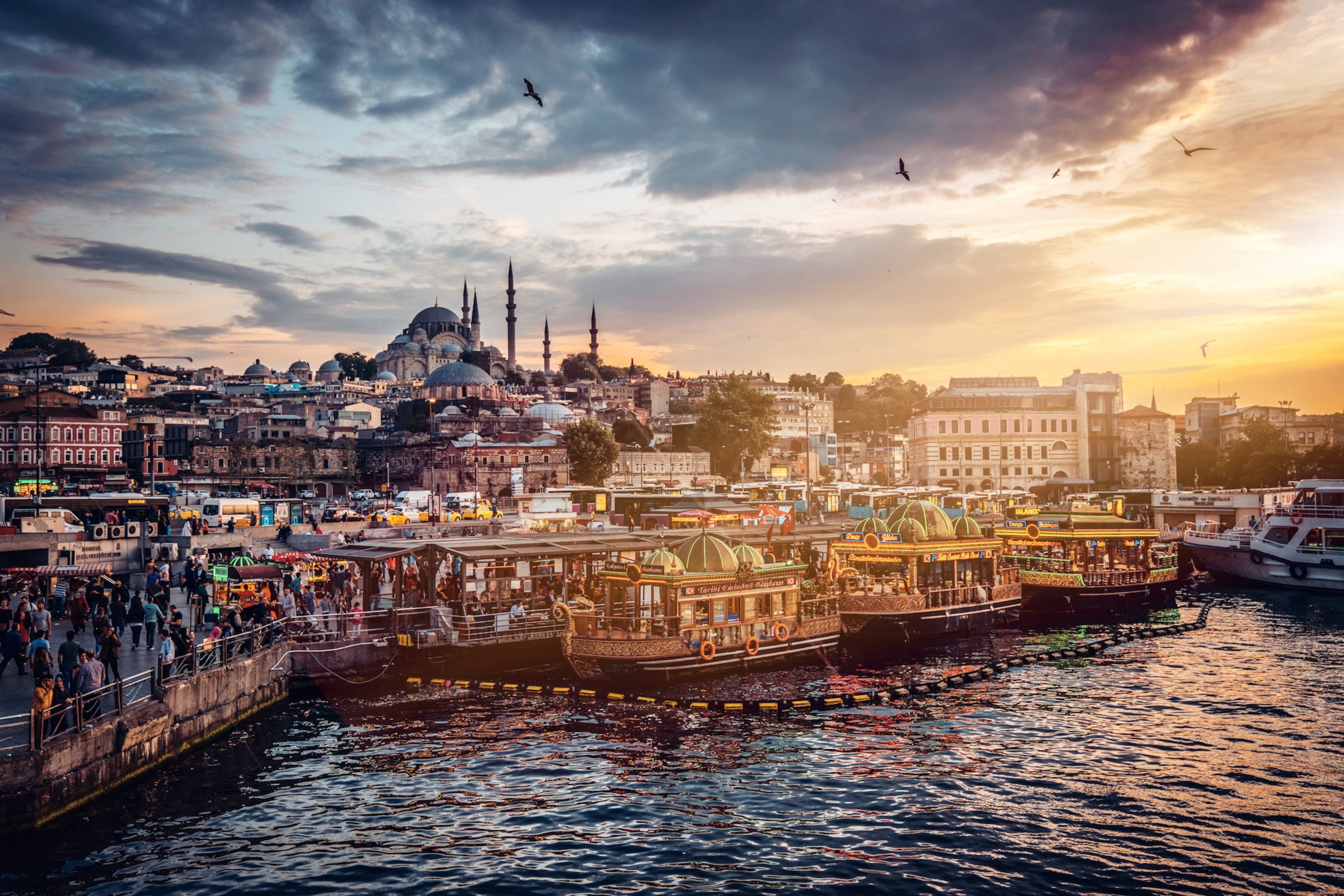 Brightly colored, highly decorated balık-ekmek (fish sandwich) boats serve fresh fish to visitors in the Golden Horn, under the shadow of the Süleymaniye Mosque and across from the Yeni Cami Mosque (New Mosque). It is a dining experience that gives a visitor one of the most authentic food traditions in the city. For over a century, fishermen have brought their catch from the Bosphorus and the Sea of Marmara to Istanbul's Galata Bridge over the Golden Horn for sale.