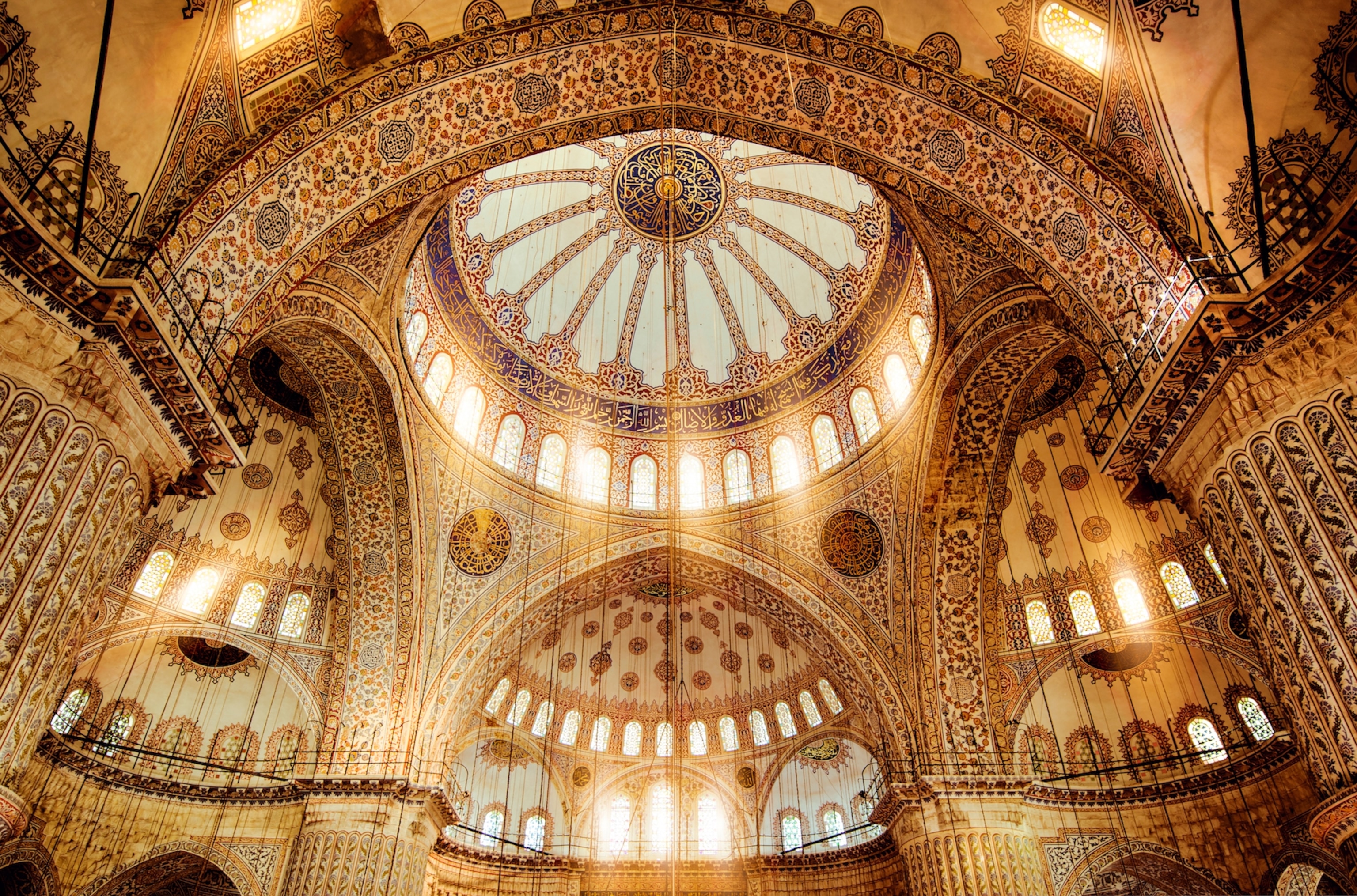 The Sultan Ahmet Mosque is known as the Blue Mosque thanks to its striking hand-painted blue tiles that decorate the interior walls. At night the tiles reflect in the lights and the mosque is bathed in a blue glow. Built between 1609 and 1616, during the rule of Ahmed I, the mosque is an impressive structure, with five main domes, six minarets, and eight secondary domes. It is found in Istanbul, next to the Hagia Sophia museum, which was previously a church and later a mosque.