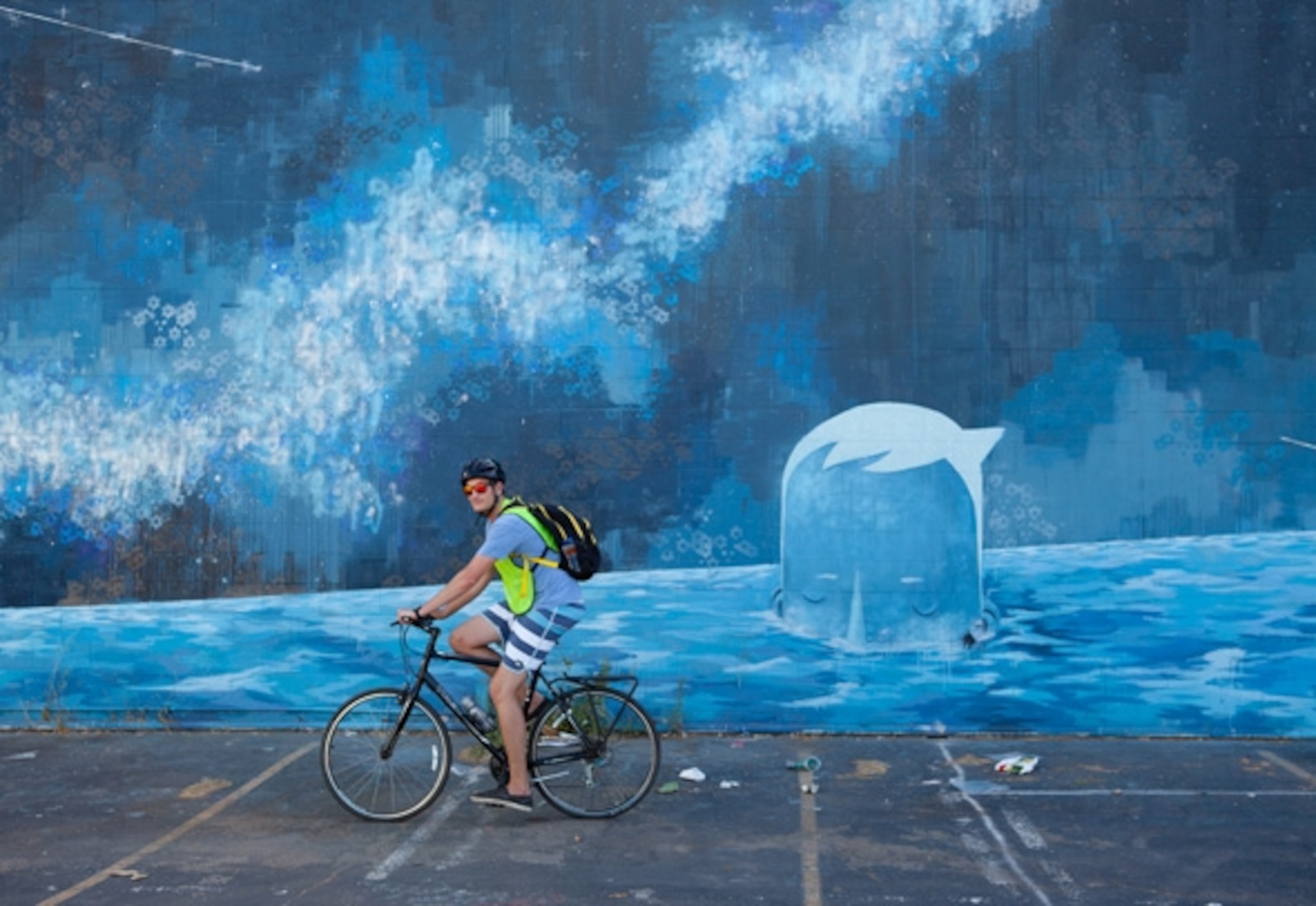 We hopped back on our trusty steeds and headed toward Marina Del Rey, riding along Ballona Creek Path until it dropped us into Culver City, where we encountered what Ryan called “Graffiti Cove ” — my favorite stop of the day. Finally, we gawked at the Gone with the Wind plantationGone with the Wind plantation, presently Culver Studios headquarters, and saw the Olympic rings at the Helms Bakery, a vestige of its status as the official bread maker of the 1932 summer games (the building now houses a series of high-end boutiques).