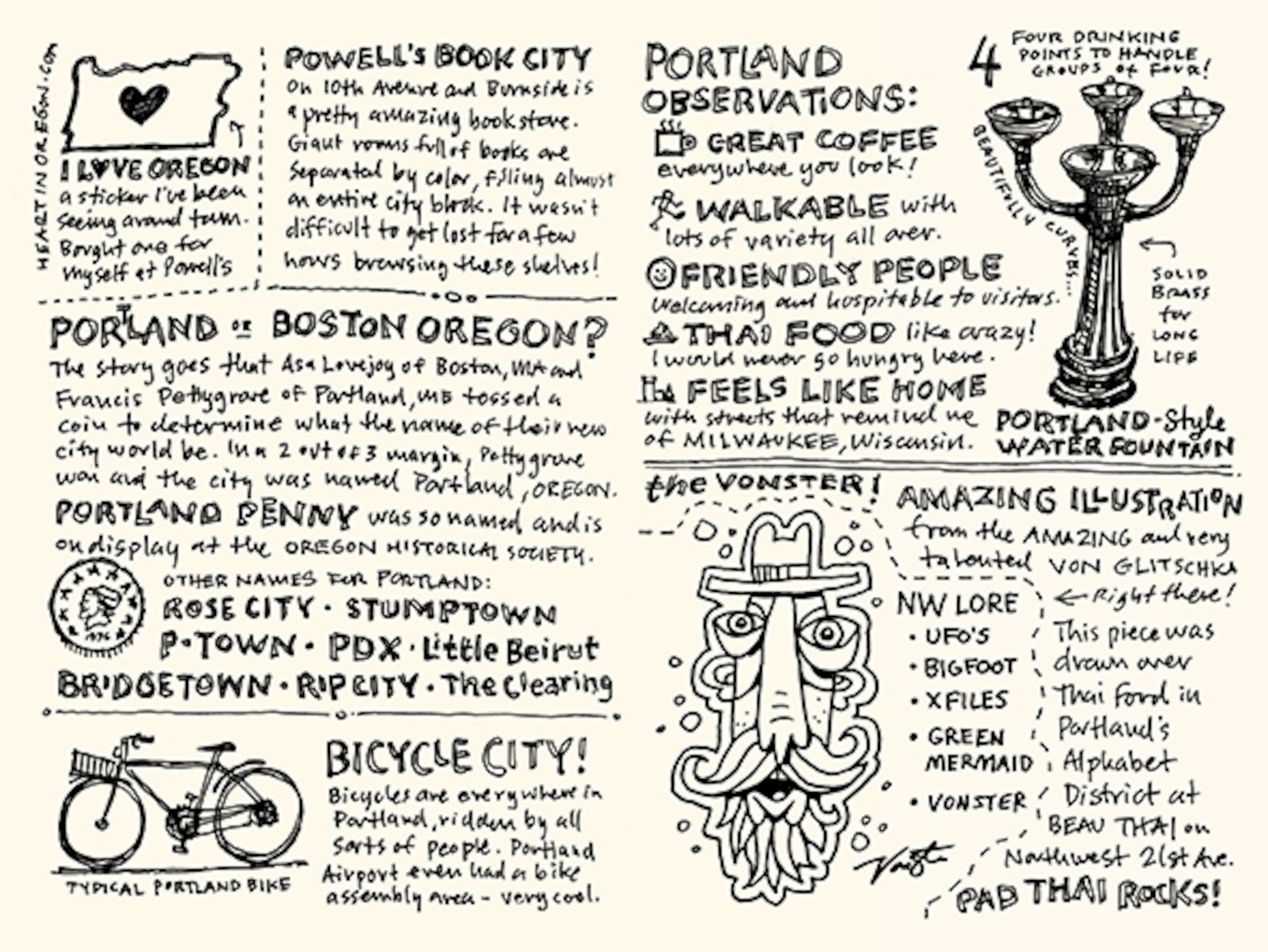 That mantra is certainly echoed by Wisconsin-based artist/author Mike Rohde, whose fun new book, The Sketchnote Handbook, illustrates how a few thoughtful drawings do a better job of capturing the spirit of an experience than pages upon pages of notes. Mike told me “sketching uses more of your brain’s capabilities…creating a more detailed, layered map,” and I agree with him.