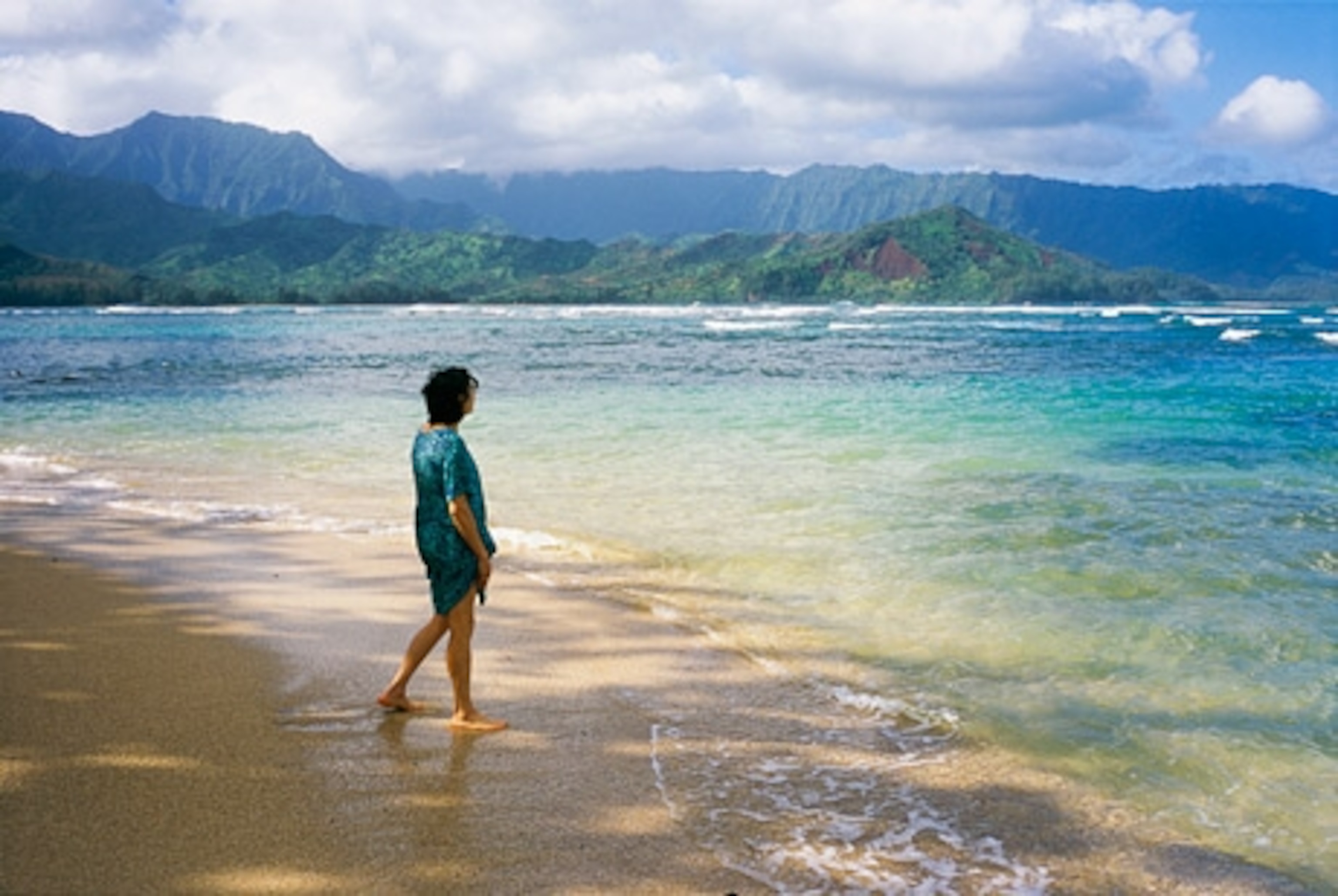 A woman dips her toes in the sand of Hanalei Bay, the top beach on Dr. Beach’s annual list.