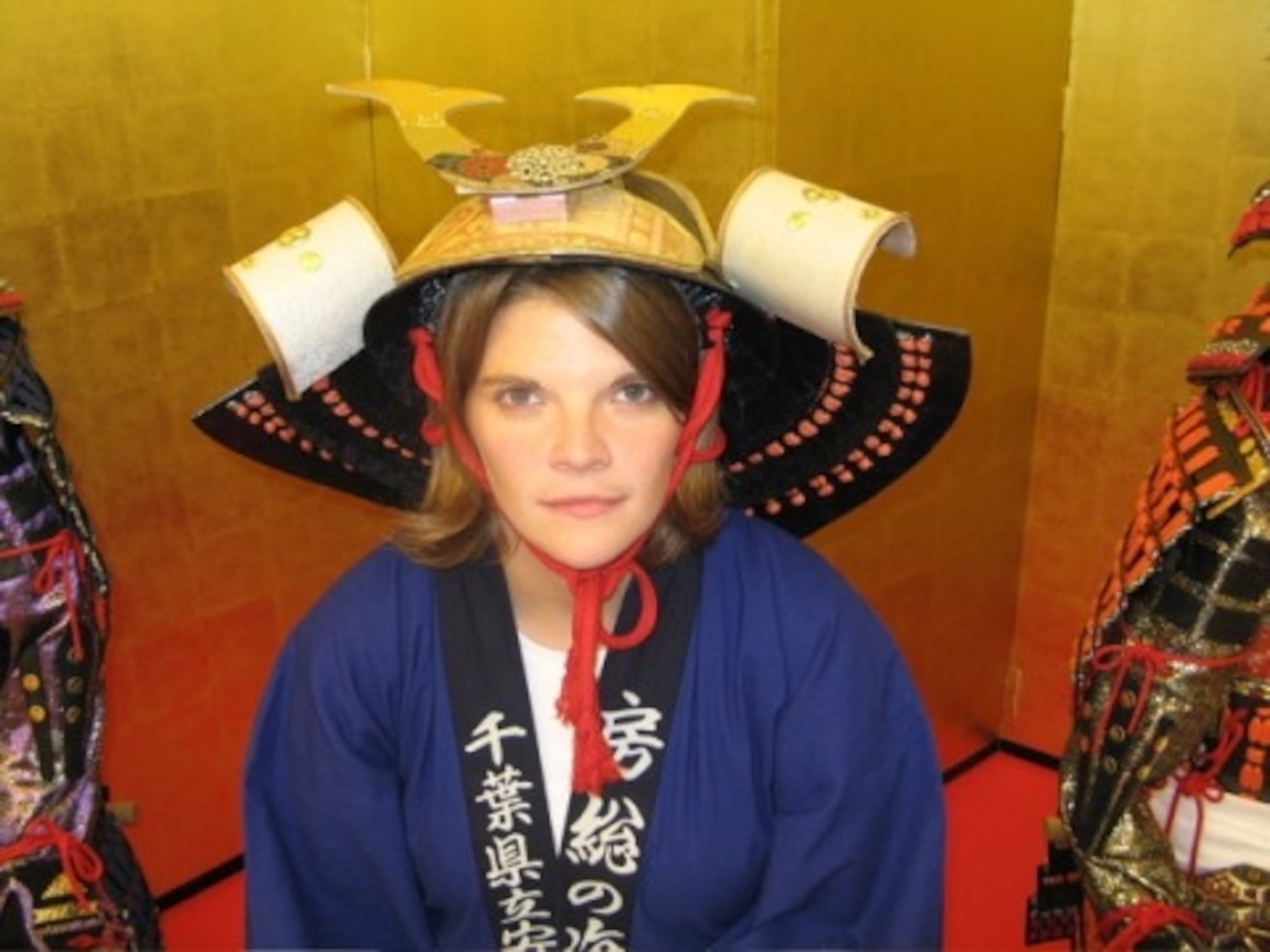 Jetlagged IT staffer Emily Haile dons a kimono and warrior hat on a layover between Bangkok and D.C.