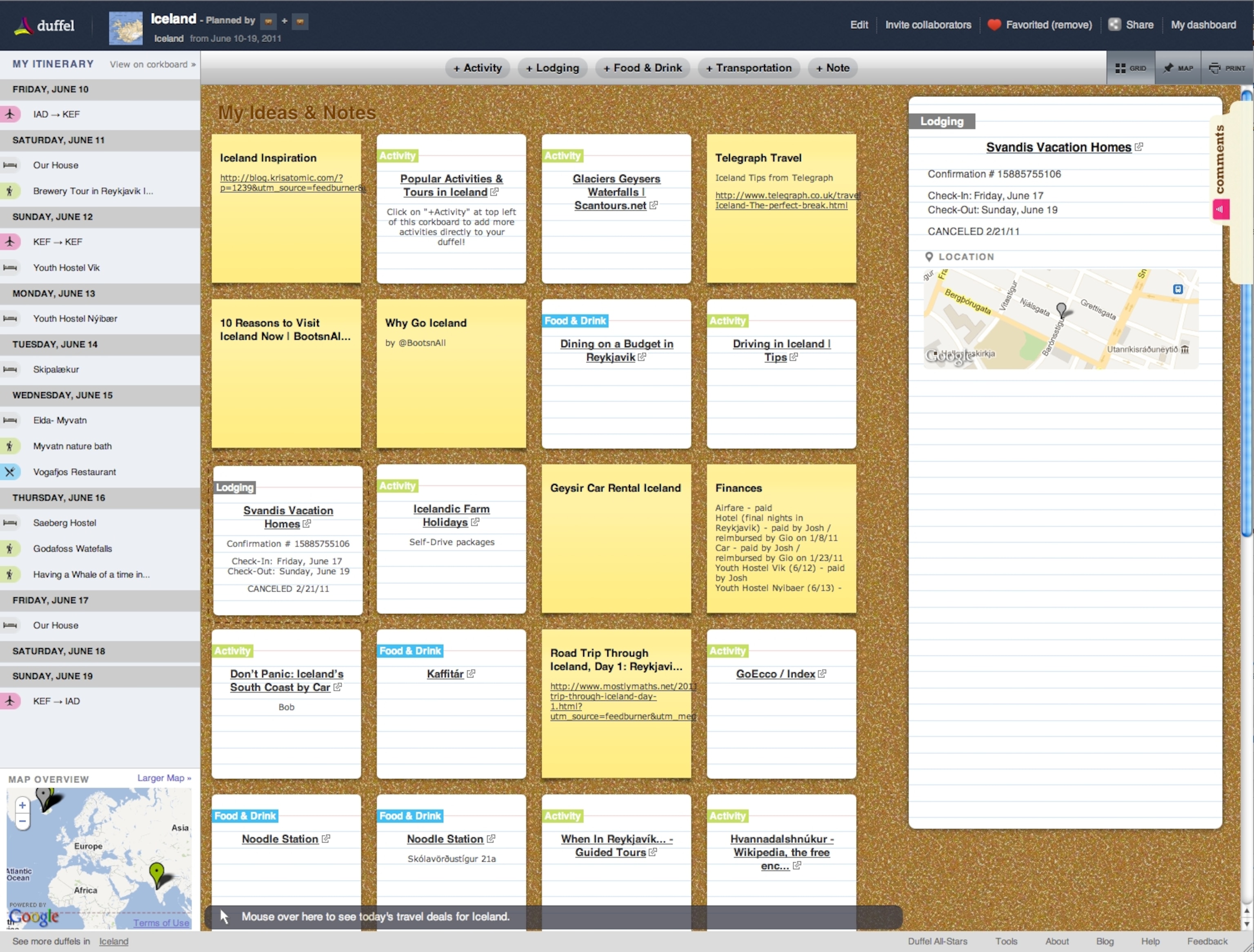 Since Duffel’s launch back in 2009, it has upgraded its site with an enhanced cork board layout and a handy “Clip-It Bookmarker,” which you can add to your web browser’s toolbar and simply click to add whatever website you’re browsing right to your duffel. Duffel also debuted an iPhone app that let’s you access all your planning and itinerary information from the road. I’ve used Duffel several times after my California trip, most recently on a week-long trip to Iceland. Duffel’s iPhone app was great to remind me of hotel phone numbers and restaurants I had researched.