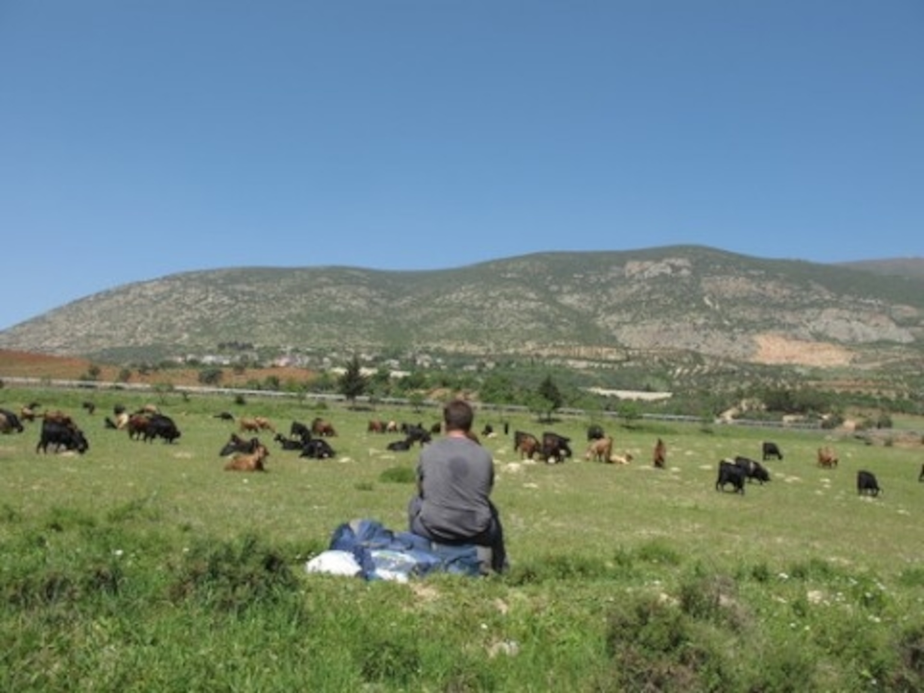 Toward the base of the mountain, I came across a man, probably in his 30s, watching over a flock of some 50-odd goats. Needing a break, I motioned to him, wondering if it would be all right for me to sit down. He nodded. I pulled out some bread and water–my typical trail food–and offered them to him. He shook his head in polite refusal.