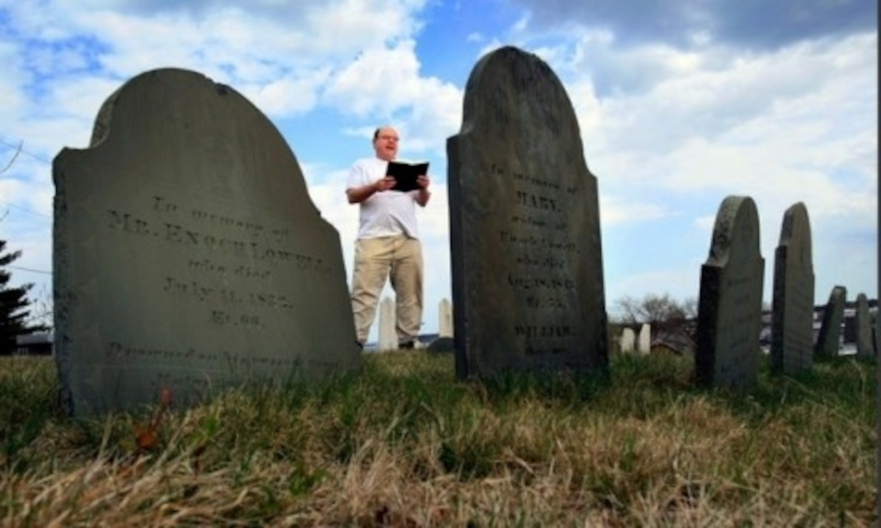 Photos: Above, Dead Poets Society founder Walter Skold reading Longfellow at Eastern Cemetery. Gregory Rec/ AP. Below: courtesy Walter Skold