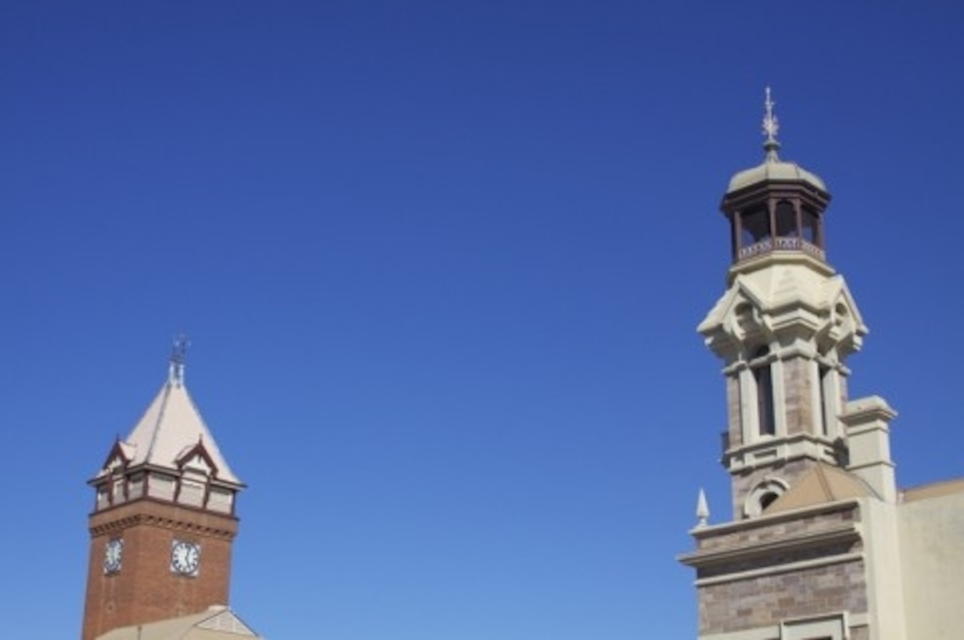 Where am I (town and state), what are these two buildings (left and right) and what two minerals inspired the street names on this corner?