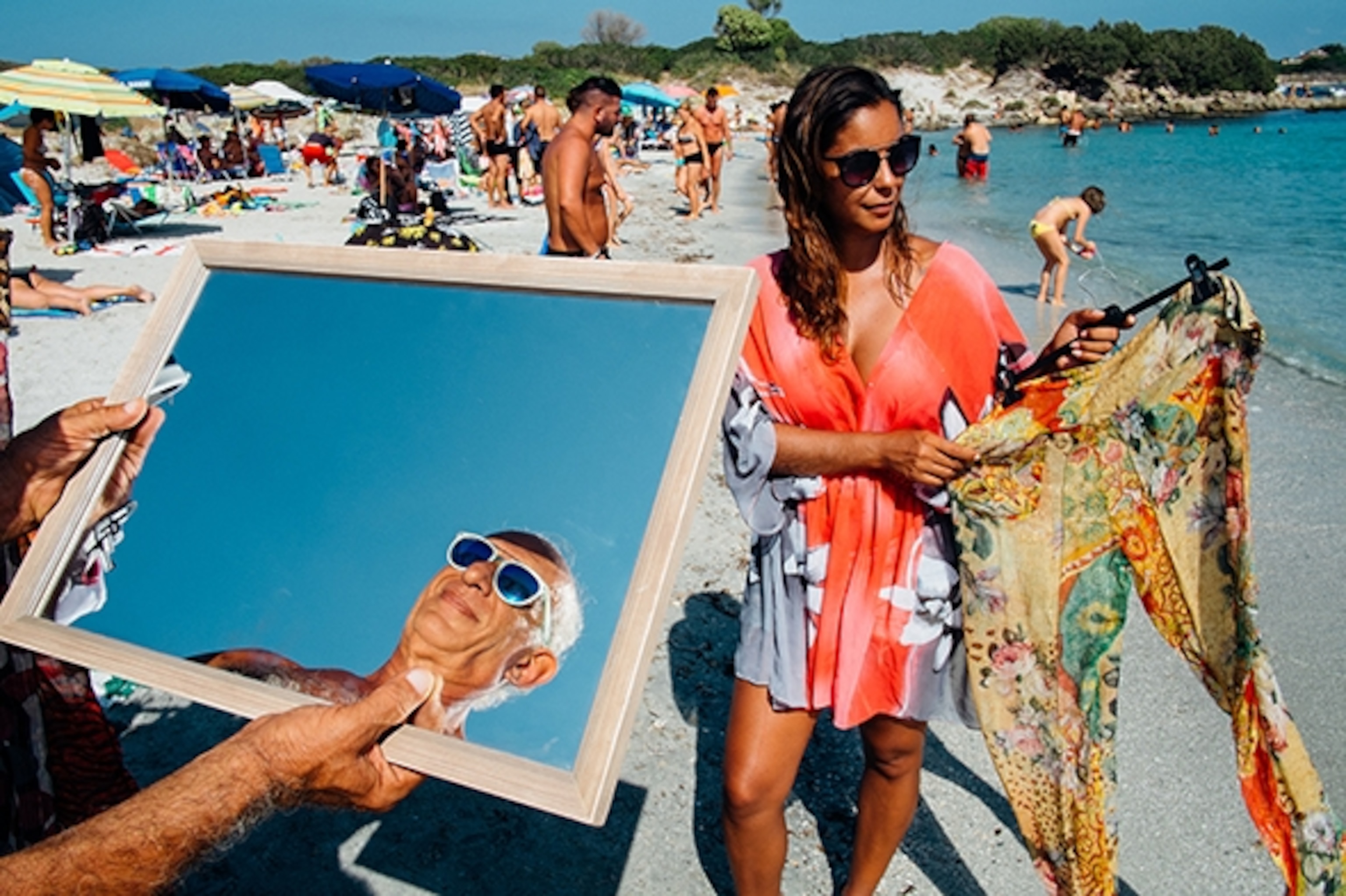 While strolling along Cala Banana beach, in Sardinia, he found his ideal subject in the form of a clothing vendor sporting some serious shades. “I saw that the man had a pretty large mirror for his customers, so I asked him to pose for me, holding the mirror in his hands,” says Cabras. ”The woman did the rest by continuing to look at the vibrant pants. Basically, this is a half-staged picture.”