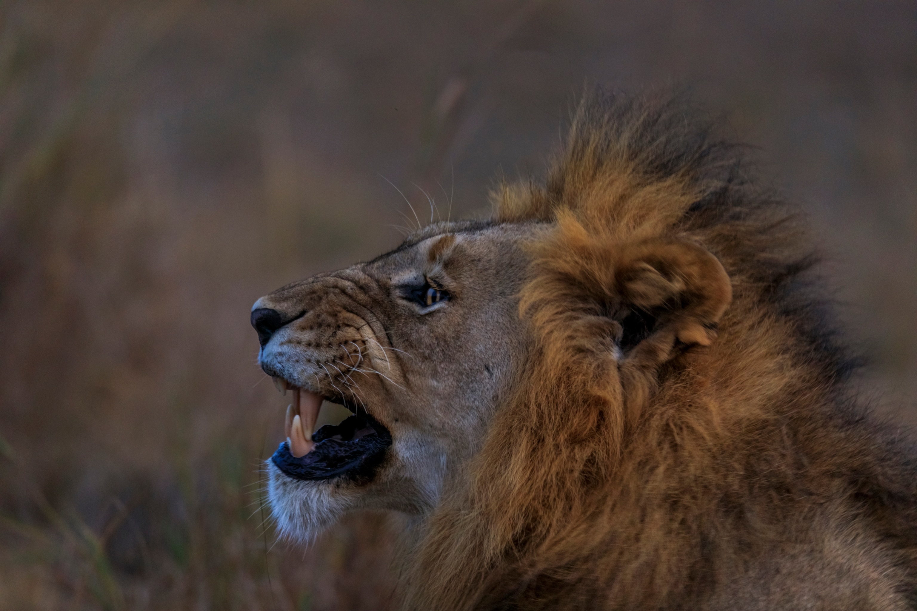 A lion rises after sunset and prepares to hunt. The Magashi peninsula, home to a luxurious game lodge at the northern end of Akagera National Park, connects travelers with guides who have an intimate understanding of the park and access to its off-road areas.