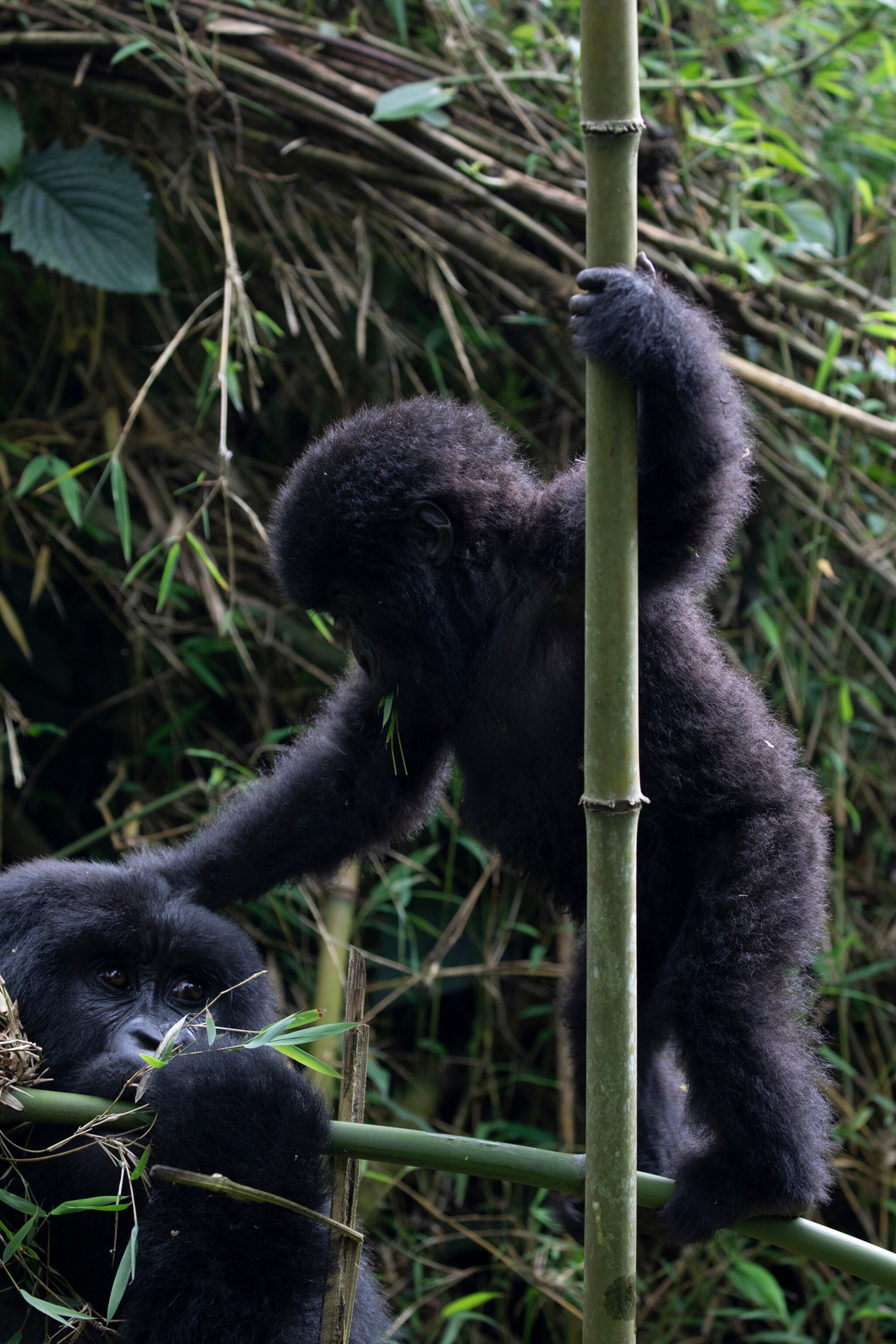 Intego plays with her mother Icyamamare in Volcanoes National Park.